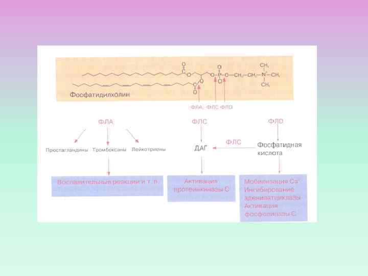 ВИДЫ ФОСФОЛИПАЗ PLА 1 – гидролиз эфирной связи в положении 1 (отщепляет SN-1 ацильную цепь). PLС – гидролиз эфирной связи в положении 3 (гидролизует связь между глицериновым остатком фосфолипида и полярной фосфатной группой) PLD - гидролизует связь между фосфатной группой и спиртовой группой PLА 2 – гидролиз эфирной связи в положении 2 (отщепляет SN-2 ацильную цепь, образование свободных жирных кислот)