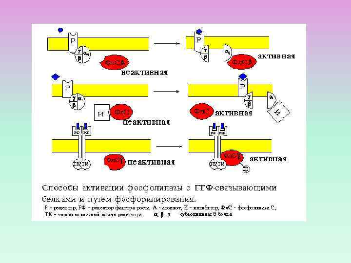 ФОСФОЛИПАЗА С: изоформы и ФОСФОЛИПАЗА С активируется через рецепторы, связанные с Gбелками (Gqбелок) ФОСФОЛИПАЗА С активируется благодаря фосфорилированию ее тирозинкиназой.