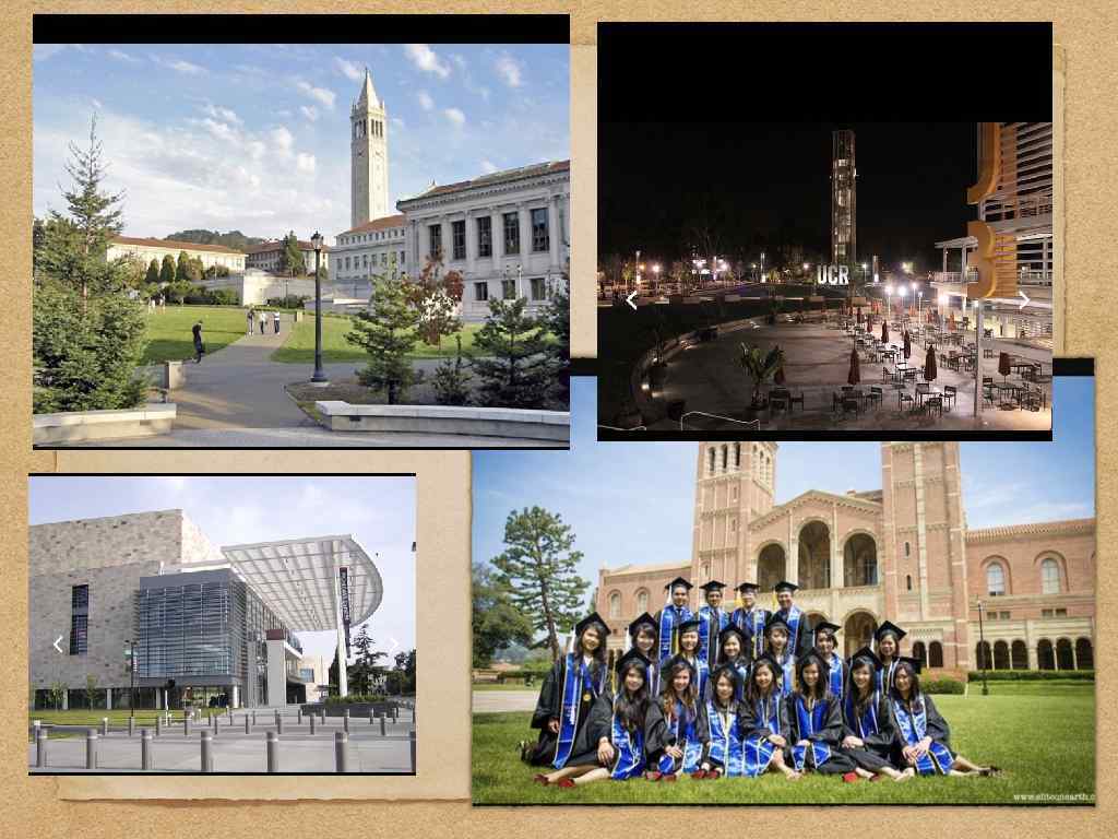 Білімі жайлы Калифорния университеті жыл сайынғы рейтинг бойынша АҚШ-тың көшбасшы ЖОО-лар қатарында болады. Штаттың әртүрлі қалаларында орналасқан 10 кампустың әрқайсысы рейтингтерде жеке университет ретінде қарастырылады. Атап айтқанда, Сан-Диего кампусының алғашқы кірпіші 40 жыл бұрын қаланғанына қарамастан, 14 Нобель сыйлығы лауреаты және бір астронавт шыққанымен танымал. Өткен жылы US News & World Report журналы өзінің ұлттық рейтингісінде Риверсайд қаласындағы университет кампусына 10 орынды берсе, Санта-Крус кампусын АҚШтағы "ең жасыл кампус" ондығына енгізді