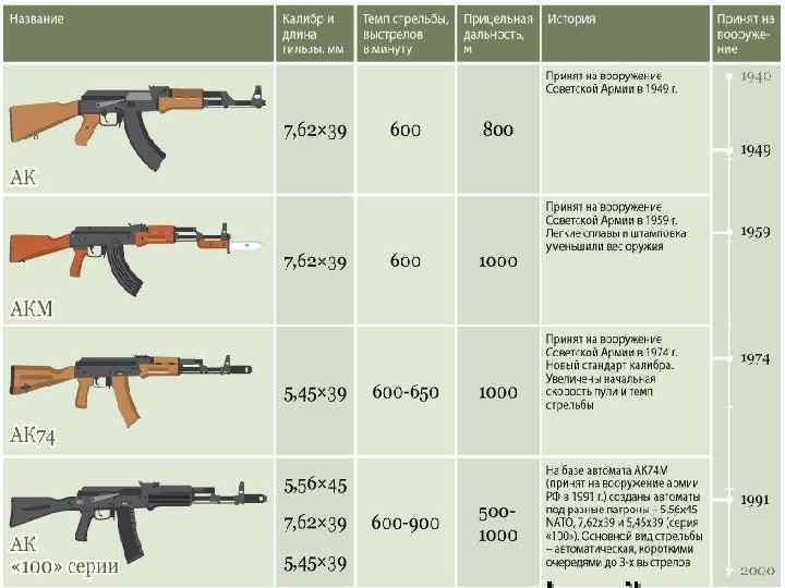 Модернізованні автомати Калашнікова АК-47 и АКС-74 . Планка Пикатінні для встановлення оптичного або колліматорного прицілу, анатомічна пистолетна рукоятка, цівка с передньою рукояткою або сошками, замість дульної гайки встановлюється дульний компенсатор