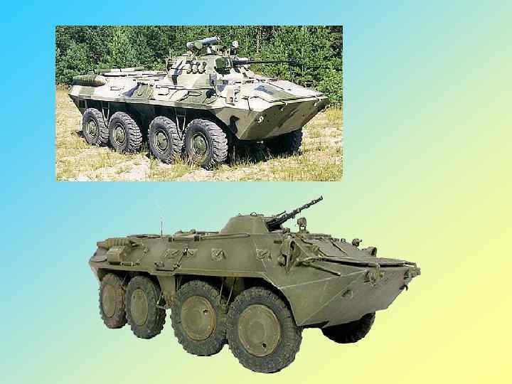 Бронетранспортери ХарактеристикиМарка машини БТР-70 БТР-80 1976 11, 5 СРСР 1982 13, 6 Держава виробник Рік прийняття на озброення Вага машини, т Бойовий розрах/десант, чел. Основне озброення: тип, калибр Боекомплект (+ в додатковій укладці) Кероване озброення: тип, кількість и назва УО е 0 Бронепробиваемість УО мм 10/9 1 -14, 5 - мм пул емет 1 -7, 62 - мм пул емет 500/2000 МТ-ЛБ М 113 А 3 «Троуджен» VАВ FV 432 США Англия Франція 1964 1987 1963 1974 10, 3 12, 3 15, 3 14, 0 13/11 12/10 1 -7, 62 - мм 1 -12, 7 - мм 1 -7, 62 - мм пул емет пулемет 2000 1600 1400 - - - Дальность стрельбы УР, км Кулемет: кількість, шт. калибр, мм Система керування вогнем Эквівалентний броневий за хист Кратність послаблення: під час вибуху / на РЗМ Максимальная швидкість, км/ч Запас хода по шоссе, км Тип и потужність двигуна, квт(л. с. ) от 7, 62 -мм пуль 80/8 52/6, 6 480 90/7 600 176(240) 119(162) 600 Карбюрат. 115 650 260 Водная перешкода Тип движителя от12, 7 мм пуль 2 5 60/7 66/6 500 Дизель, 240 202(240) Плавающая Колесный Гусеничный Колесный