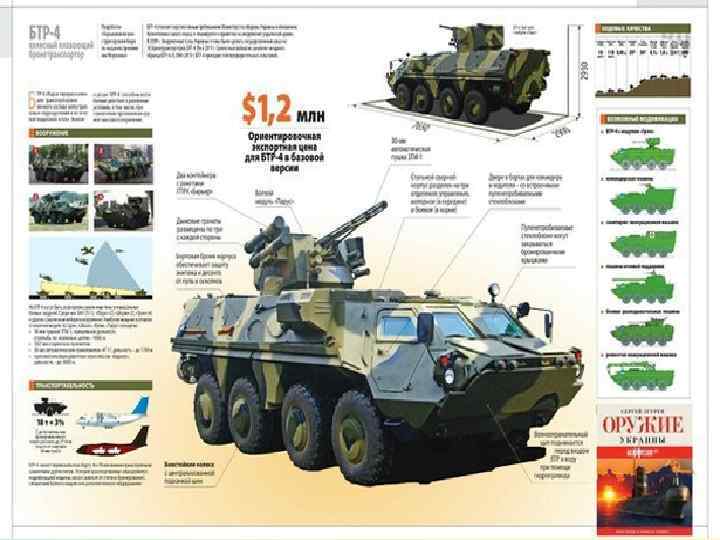 БТР-3 Е 1 Бойова колісна плаваюча машина з броньованим захистом. Призначена для виявлення, розпізнавання й ураження наземних і низьких цілей. Оснащена 30 -мм автоматичною гарматою на 350 снарядів, 7, 62 -мм кулеметом на 2, 000 патронів, протитанковим ракетним комплексом Бар’єр з 4 ракетами і 30 -мм гранатометом. .
