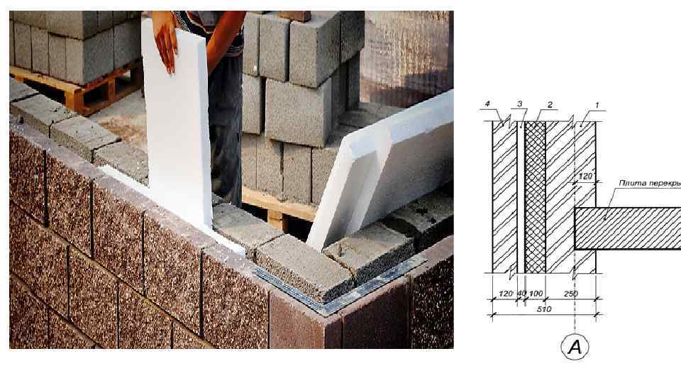 Изоляция полых стен (новое строительство) 1 - Защитная кладка 2 - ПЕНОПЛЭКС® 3 - Несущая стена 4 - Внутренняя отделка 5 - Гибкие связи из стеклопластика