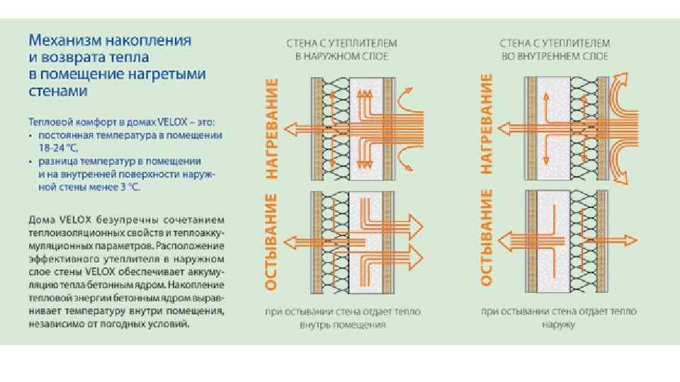 Высокие энергосберегающие свойства системы достигаются благодаря правильной наружной стене VELOX. Она состоит из бетонного ядра, заключенного в капсулу из минерализованной щепоцементной плиты с внутренней и щепоцементной плиты с утеплителем с наружной стороны здания. В такой конструкции бетон работает как аккумулятор энергии. При остывании помещения он является дополнительным источником тепла. Точка росы находится в утеплителе, бетонное ядро всегда сухое, теплое, не подвергается циклам заморажива-ния/размораживания, поэтому конструкция VELOX практически вечная. Технология применяется не только для строительства новых энергосберегающих зданий, но и утепления существующих. Применение плит VELOX для утепления домов позволяет надежно защитить от пожара и утеплить ограждающие конструкции дома.