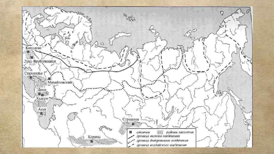 Карта распространения памятников олдувая (зелёные), ашеля (голубые) и мустье (синие) на Русской Равнине.