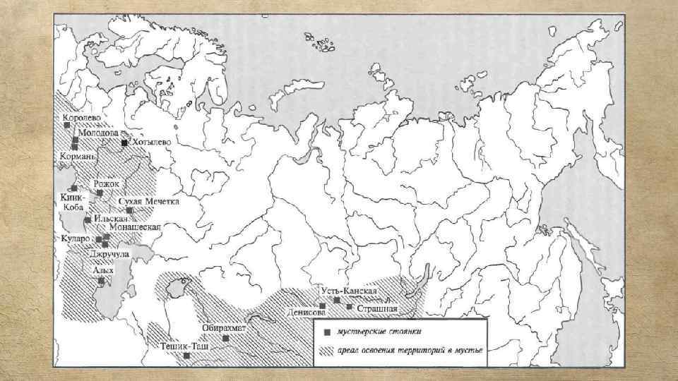 Стоянки мустьерской культуры известны в Выхватинцах в Молдове, на берегах Среднего Дона и Средней Волги, в Антоновке в Приазовье, на Днепровских порогах, в Усть-Канской им. Окладникова и Страшной пещерах на Алтае. Одним из опорных памятников Северной Азии является Денисова пещера в Горном Алтае.