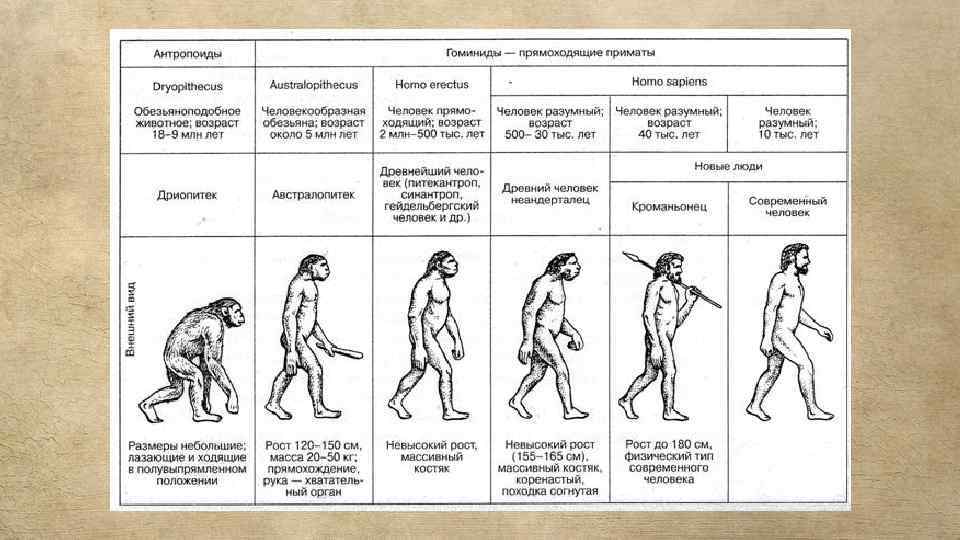 Особенности человека прямоходящего: – обладал умением речи и абстрактно мыслить; – умел создавать достаточно сложные предметы труда, обращаться с огнём. Существует предположение, что прямоходящий человек мог добывать огонь самостоятельно; – внешним видом напоминает черты современных людей. Однако имеются значительные отличия: стенки черепа достаточно толстые, лобная кость располагается ниже и имеет массивные надглазные выступы. Тяжёлая нижняя челюсть более крупная, а подбородочный выступ почти незаметен; – самцы были намного крупнее самок; – рост около 150 -180 см, размер мозга увеличился до 1100 см³.