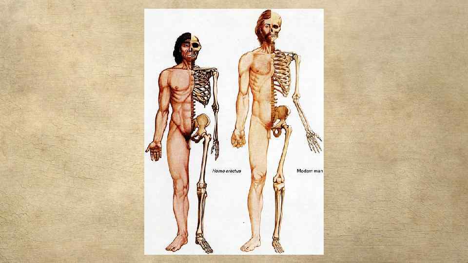 Homo erectus Эректус, или человек прямоходящий, существовал 1 млн. — 300 лет назад. Своё название получил от окончательного перехода к прямой ходьбе. Эти гоминиды продолжали расселение по планете, достигнув на востоке Индонезии, а на западе — Испании. При этом население, судя по всему, концентрировалось в южных областях и не выходило за пределы субтропического пояса. Создатели ранней и средней ашельской культуры.
