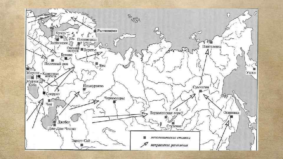 Орудия и техника их изготовления Обработка камня во многом продолжила традиции палеолита. Прежде всего, развивается призматическая техника раскалывания. Получение и использование тонких микропластинок правильных очертаний достигает в мезолите своего расцвета. Перестройка характера охоты, вызванная изменениями окружающей среды, требовала усовершенствования всех видов метательного оружия, в частности лука и стрел.