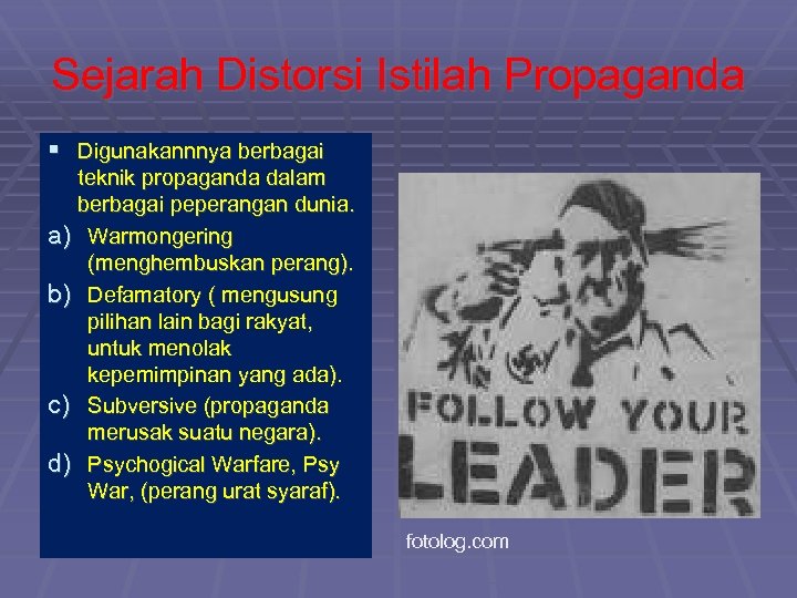 Sejarah Distorsi Istilah Propaganda § Digunakannnya berbagai teknik propaganda dalam berbagai peperangan dunia. a) Warmongering (menghembuskan perang). b) Defamatory ( mengusung pilihan lain bagi rakyat, untuk menolak kepemimpinan yang ada). c) Subversive (propaganda merusak suatu negara). d) Psychogical Warfare, Psy War, (perang urat syaraf). fotolog. com