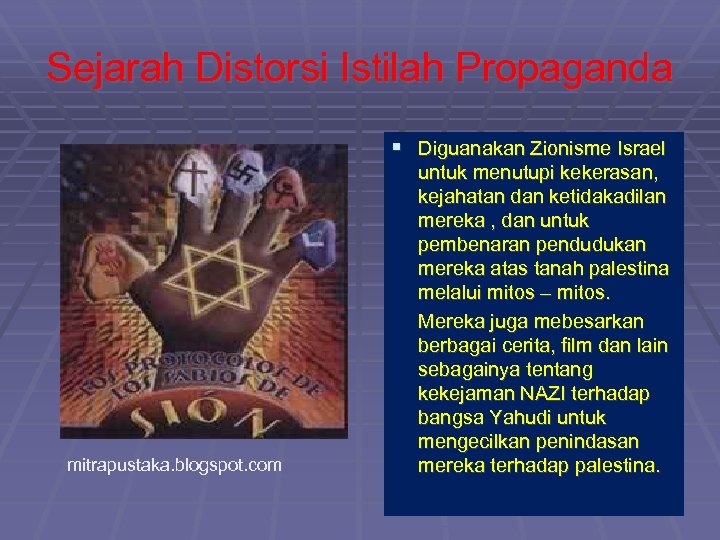 Sejarah Distorsi Istilah Propaganda § Diguanakan Zionisme Israel mitrapustaka. blogspot. com untuk menutupi kekerasan, kejahatan dan ketidakadilan mereka , dan untuk pembenaran pendudukan mereka atas tanah palestina melalui mitos – mitos. Mereka juga mebesarkan berbagai cerita, film dan lain sebagainya tentang kekejaman NAZI terhadap bangsa Yahudi untuk mengecilkan penindasan mereka terhadap palestina.