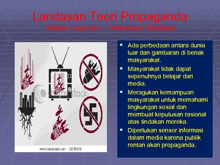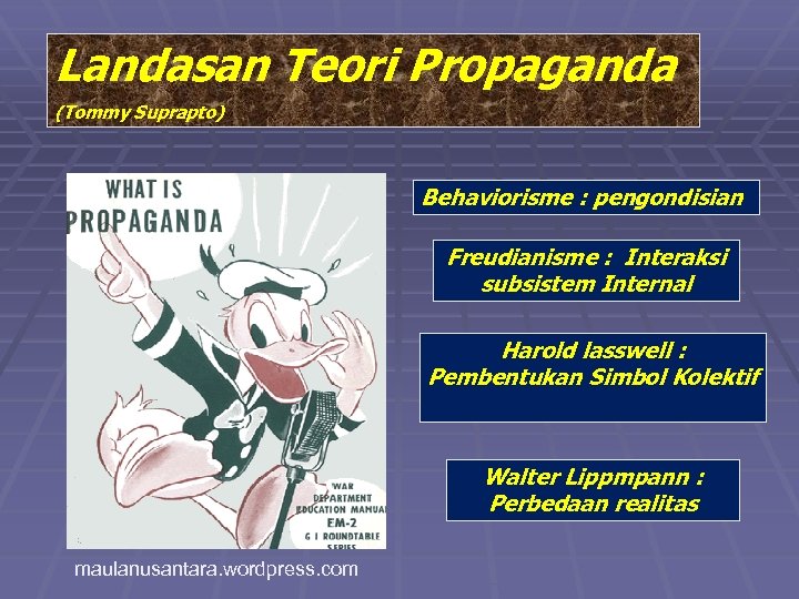 Landasan Teori Propaganda (Tommy Suprapto) Behaviorisme : pengondisian Freudianisme : Interaksi subsistem Internal Harold lasswell : Pembentukan Simbol Kolektif Walter Lippmpann : Perbedaan realitas maulanusantara. wordpress. com