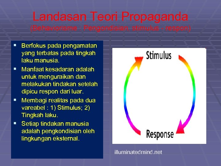 Landasan Teori Propaganda (Behaviorisme : Pengondisian, stimulus - respon) § Berfokus pada pengamatan § § § yang terbatas pada tingkah laku manusia. Manfaat kesadaran adalah untuk menguraikan dan melakukan tindakan setelah dipicu respon dari luar. Membagi realitas pada dua vareabel : 1) Stimulus; 2) Tingkah laku. Setiap tindakan manusia adalah pengkondisian oleh lingkungan eksternal. illuminatedmind. net