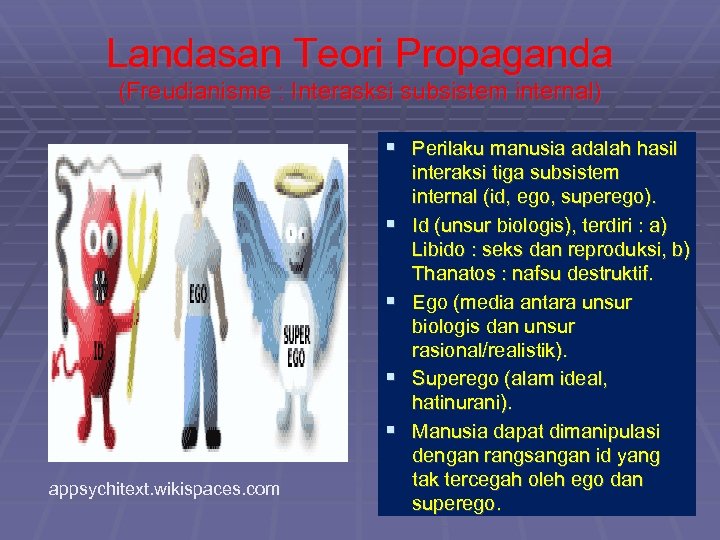 Landasan Teori Propaganda (Freudianisme : Interasksi subsistem internal) § Perilaku manusia adalah hasil § § appsychitext. wikispaces. com interaksi tiga subsistem internal (id, ego, superego). Id (unsur biologis), terdiri : a) Libido : seks dan reproduksi, b) Thanatos : nafsu destruktif. Ego (media antara unsur biologis dan unsur rasional/realistik). Superego (alam ideal, hatinurani). Manusia dapat dimanipulasi dengan rangsangan id yang tak tercegah oleh ego dan superego.