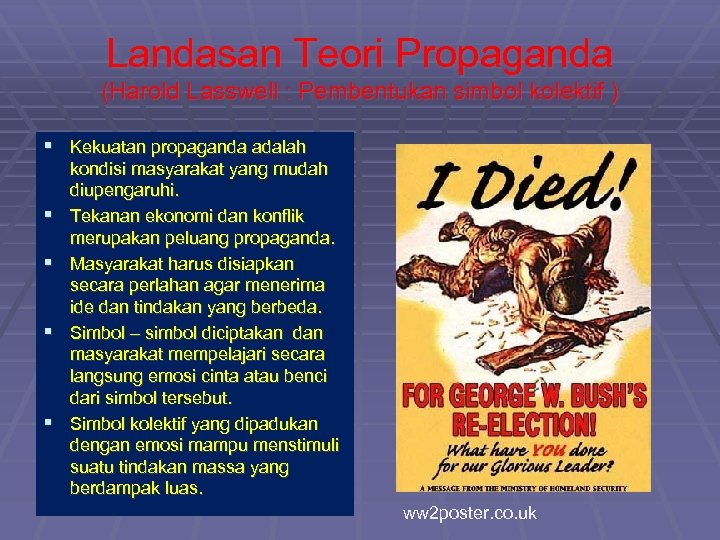 Landasan Teori Propaganda (Harold Lasswell : Pembentukan simbol kolektif ) § Kekuatan propaganda adalah § § kondisi masyarakat yang mudah diupengaruhi. Tekanan ekonomi dan konflik merupakan peluang propaganda. Masyarakat harus disiapkan secara perlahan agar menerima ide dan tindakan yang berbeda. Simbol – simbol diciptakan dan masyarakat mempelajari secara langsung emosi cinta atau benci dari simbol tersebut. Simbol kolektif yang dipadukan dengan emosi mampu menstimuli suatu tindakan massa yang berdampak luas. ww 2 poster. co. uk