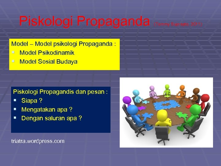 Piskologi Propaganda Model – Model psikologi Propaganda : § Model Psikodinamik § Model Sosial Budaya Piskologi Propagandis dan pesan : § Siapa ? § Mengatakan apa ? § Dengan saluran apa ? triatra. wordpress. com (Tommy Suprapto, 2011)