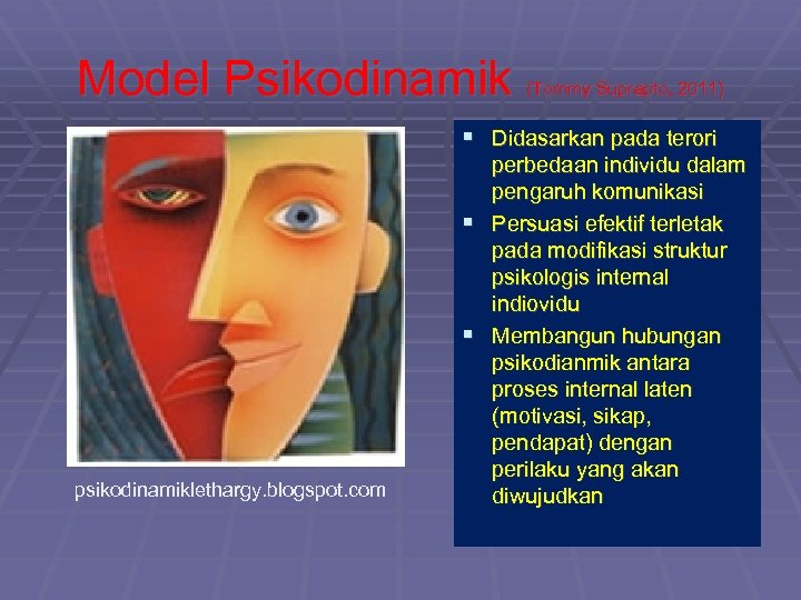 Model Psikodinamik (Tommy Suprapto, 2011) § Didasarkan pada terori psikodinamiklethargy. blogspot. com perbedaan individu dalam pengaruh komunikasi § Persuasi efektif terletak pada modifikasi struktur psikologis internal indiovidu § Membangun hubungan psikodianmik antara proses internal laten (motivasi, sikap, pendapat) dengan perilaku yang akan diwujudkan