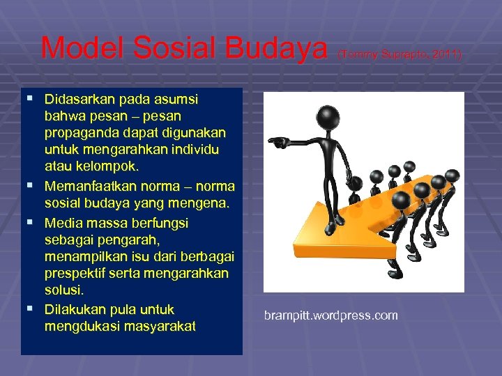Model Sosial Budaya (Tommy Suprapto, 2011) § Didasarkan pada asumsi § § § bahwa pesan – pesan propaganda dapat digunakan untuk mengarahkan individu atau kelompok. Memanfaatkan norma – norma sosial budaya yang mengena. Media massa berfungsi sebagai pengarah, menampilkan isu dari berbagai prespektif serta mengarahkan solusi. Dilakukan pula untuk mengdukasi masyarakat brampitt. wordpress. com