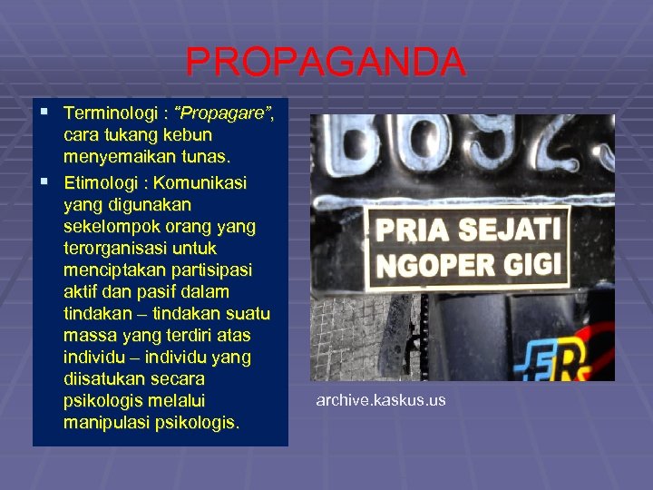 PROPAGANDA § Terminologi : “Propagare”, cara tukang kebun menyemaikan tunas. § Etimologi : Komunikasi yang digunakan sekelompok orang yang terorganisasi untuk menciptakan partisipasi aktif dan pasif dalam tindakan – tindakan suatu massa yang terdiri atas individu – individu yang diisatukan secara psikologis melalui manipulasi psikologis. archive. kaskus. us