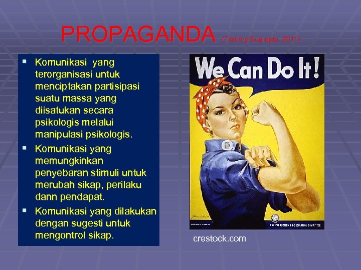 PROPAGANDA (Tommy Suprapto, 2011) § Komunikasi yang terorganisasi untuk menciptakan partisipasi suatu massa yang diisatukan secara psikologis melalui manipulasi psikologis. § Komunikasi yang memungkinkan penyebaran stimuli untuk merubah sikap, perilaku dann pendapat. § Komunikasi yang dilakukan dengan sugesti untuk mengontrol sikap. crestock. com