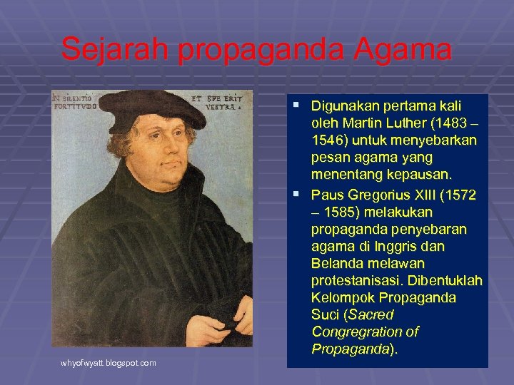 Sejarah propaganda Agama § Digunakan pertama kali oleh Martin Luther (1483 – 1546) untuk menyebarkan pesan agama yang menentang kepausan. § Paus Gregorius XIII (1572 – 1585) melakukan propaganda penyebaran agama di Inggris dan Belanda melawan protestanisasi. Dibentuklah Kelompok Propaganda Suci (Sacred Congregration of Propaganda). whyofwyatt. blogspot. com