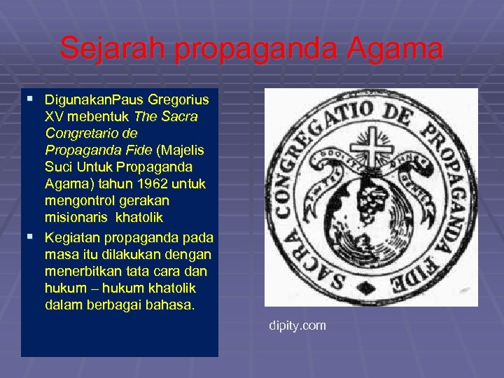 Sejarah propaganda Agama § Digunakan. Paus Gregorius XV mebentuk The Sacra Congretario de Propaganda Fide (Majelis Suci Untuk Propaganda Agama) tahun 1962 untuk mengontrol gerakan misionaris khatolik § Kegiatan propaganda pada masa itu dilakukan dengan menerbitkan tata cara dan hukum – hukum khatolik dalam berbagai bahasa. dipity. com
