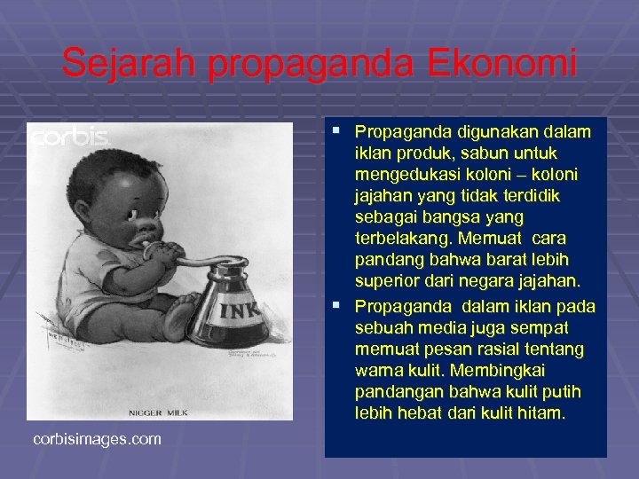 Sejarah propaganda Ekonomi § Propaganda digunakan dalam iklan produk, sabun untuk mengedukasi koloni – koloni jajahan yang tidak terdidik sebagai bangsa yang terbelakang. Memuat cara pandang bahwa barat lebih superior dari negara jajahan. § Propaganda dalam iklan pada sebuah media juga sempat memuat pesan rasial tentang warna kulit. Membingkai pandangan bahwa kulit putih lebih hebat dari kulit hitam. corbisimages. com
