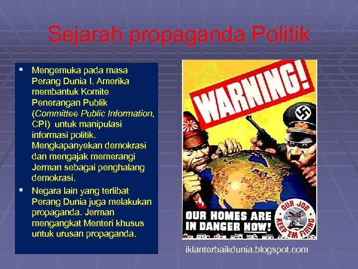 Sejarah propaganda Politik § Mengemuka pada masa Perang Dunia I. Amerika membantuk Komite Penerangan Publik (Committee Public Information, CPI) untuk manipulasi informasi politik. Mengkapanyekan demokrasi dan mengajak memerangi Jerman sebagai penghalang demokrasi. § Negara lain yang terlibat Perang Dunia juga melakukan propaganda. Jerman mengangkat Menteri khusus untuk urusan propaganda. iklanterbaikdunia. blogspot. com