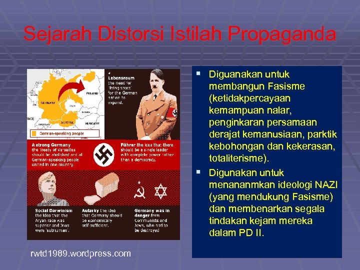 Sejarah Distorsi Istilah Propaganda § Diguanakan untuk membangun Fasisme (ketidakpercayaan kemampuan nalar, penginkaran persamaan derajat kemanusiaan, parktik kebohongan dan kekerasan, totaliterisme). § Digunakan untuk menananmkan ideologi NAZI (yang mendukung Fasisme) dan membenarkan segala tindakan kejam mereka dalam PD II. rwtd 1989. wordpress. com