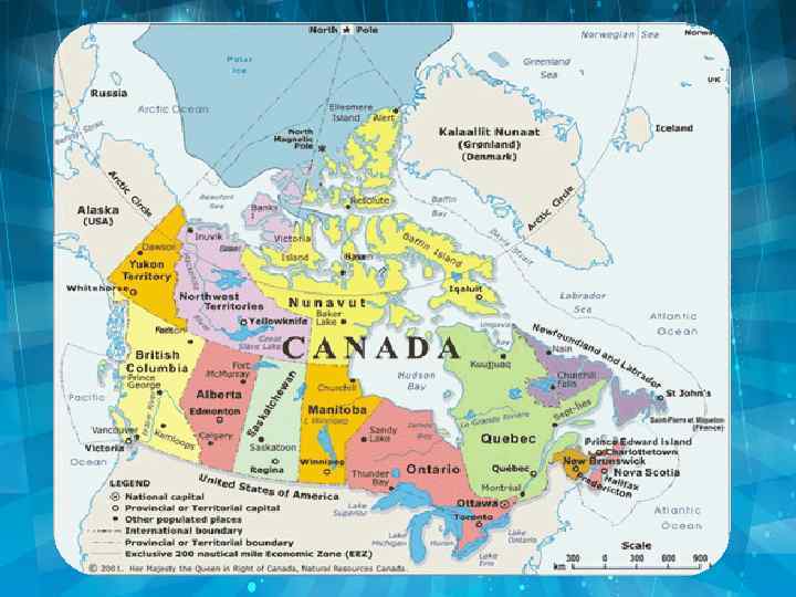Страна лесов и озёр Площадь: 9970610 кв. км. Население: 31000000 человек Столица: Оттава Основные языки: английский, французский Основные религии: католицизм, протестантизм • Денежная единица: канадский доллар • Государственный строй: государство во главе с королевой Великобритании, член Содружества. • • •