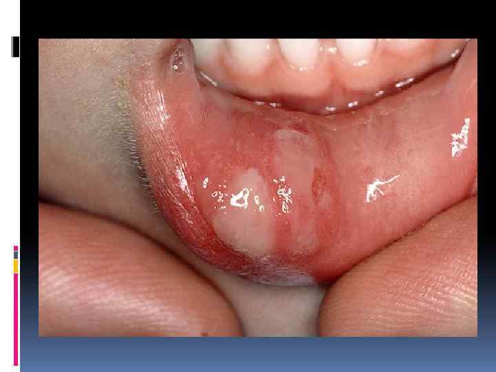 Клиническая картина У детей грудного возраста матери обращают внимание на появление на СО щек, губ, языка, неба белых пятен или белого творожистого налета, который в основном накапливается в ретенционных зонах в виде бляшек или пленки. При легком течении заболевания бляшки свободно снимаются, оставляя на своем месте очаг гиперемии; при тяжелом — очаги наслоения налета сливаются в сплошные пленчатые поверхности, которые со временем утолщаются и распространяются на все участки СОПР. При поскабливании такой налет отслаивается нелегко, а под ним обнаруживается эритема, а иногда — и кровоточащие эрозии
