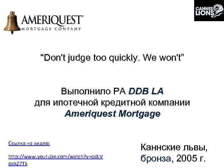 "Don't judge too quickly. We won't” Выполнило РА DDB LA для ипотечной кредитной компании Ameriquest Mortgage Ссылка на видео: Каннские львы, http: //www. youtube. com/watch? v=qd. LV бронза, 2005 г. qak. Z 7 Tk