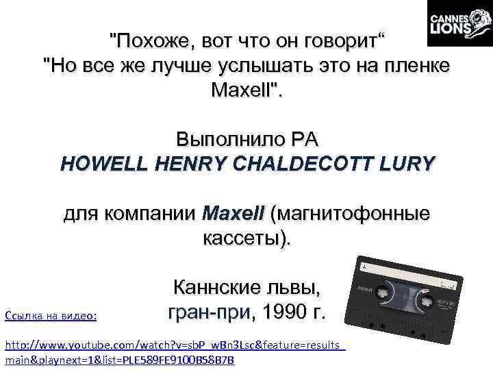 "Похоже, вот что он говорит“ "Но все же лучше услышать это на пленке Maxell". Выполнило РА HOWELL HENRY CHALDECOTT LURY для компании Maxell (магнитофонные кассеты). Ссылка на видео: Каннские львы, гран-при, 1990 г. http: //www. youtube. com/watch? v=sb. P_w. Bn 3 Lsc&feature=results_ main&playnext=1&list=PLE 589 FE 9100 B 58 B 7 B