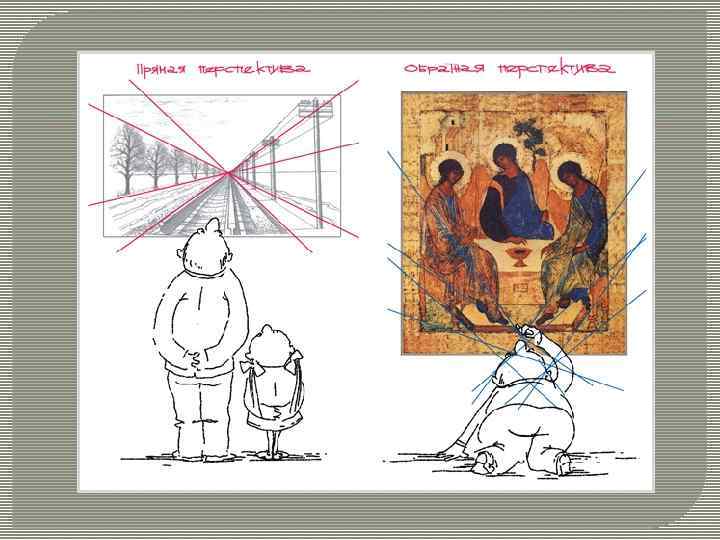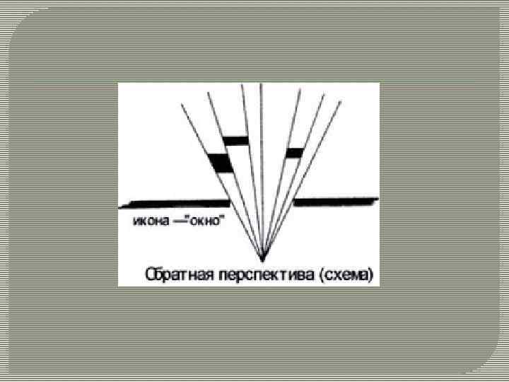Икона - это окно в священный мир, и мир этот распахивается перед человеком, взирающим на икону, раздается вширь простирается. Пространство не от мира сего обладает свойствами, отличными от свойств земного пространства, не доступными телесному зрению и не объяснимыми логикой здешнего мира. Возникает обратная перспектива: предметы тоже расширяются при их удалении от зрителя.
