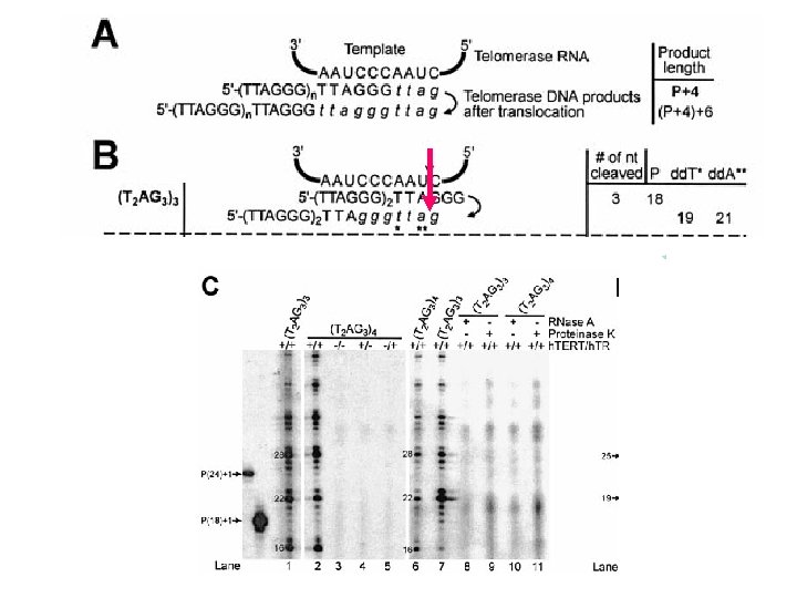 Эндонуклеазная активность Функции: - Удаление нетеломерных последовательностей на 3 конце ДНК (связывается комплементарно с матрицей, то, что за матрицей обрезается) - Разрез в случае присутствия мисметча с РНК-матрицей( ТЕRС) - Выравнивание 3’-конца ДНК-праймера по трем 5’-нуклеотидам матрицы(AAU)