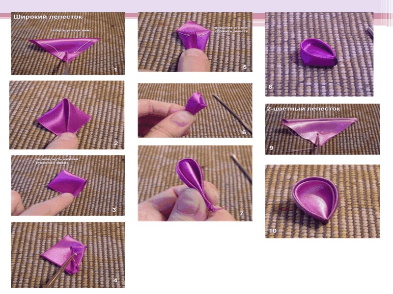 Особенности техники «канзаши». Несмотря на разнообразие стилей , оказывается, техника «канзаши» до удивления однообразна. Удивительно , как с таким минимальным количеством исходного материала можно придумать такое разнообразие бесподобных по красоте украшений. Если в традиционном оригами используется бумага , то для «канзаши» используется ткань. Цветы, снежинки, звёздочки и прочие элементы делаются из квадратиков шёлка, атласа и другой подобной ткани. Сначала мастерят лепестки , а потом из них собирают узор. Существует два основных вида лепестка – острый и круглый. На их основе делается большинство украшений.