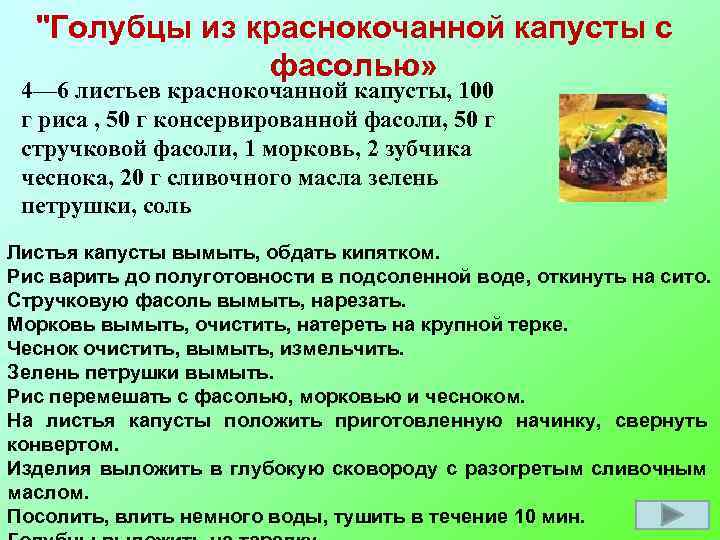 "Голубцы из краснокочанной капусты с фасолью» 4— 6 листьев краснокочанной капусты, 100 г риса , 50 г консервированной фасоли, 50 г стручковой фасоли, 1 морковь, 2 зубчика чеснока, 20 г сливочного масла зелень петрушки, соль Листья капусты вымыть, обдать кипятком. Рис варить до полуготовности в подсоленной воде, откинуть на сито. Стручковую фасоль вымыть, нарезать. Морковь вымыть, очистить, натереть на крупной терке. Чеснок очистить, вымыть, измельчить. Зелень петрушки вымыть. Рис перемешать с фасолью, морковью и чесноком. На листья капусты положить приготовленную начинку, свернуть конвертом. Изделия выложить в глубокую сковороду с разогретым сливочным маслом. Посолить, влить немного воды, тушить в течение 10 мин.