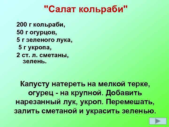 "Салат кольраби" 200 г кольраби, 50 г огурцов, 5 г зеленого лука, 5 г укропа, 2 ст. л. сметаны, зелень. Капусту натереть на мелкой терке, огурец - на крупной. Добавить нарезанный лук, укроп. Перемешать, залить сметаной и украсить зеленью.