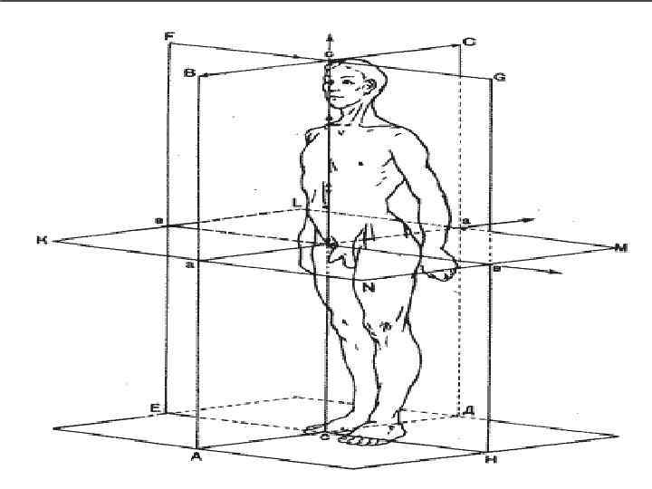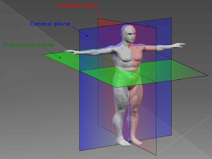 ЖАЗЫҚТЫҚТАР Сагитталді жазықтық , XZ, денені оң және сол жартыға бөледі, разделяет правую и левую половины тела. Дненің екіге бөлінгендегі ортаңғы жазықтығы сагиталді жазықтық деп аталады. Фронталді жазықтық, немесе короналді, YZ, көлденең орналасқан, сагиталді жазыққа перпендикулярлы, ол дененің алдыңғы бөлігін(вентральную) артқы бөлігінен (дорсальной)ажыратады. Горизонталді, аксиалді, немесе көлденең жазықтық, XY, алдыңғы екеуімен перпендикулярлы және жер бетіне параллелді жатады. Бұл жазықтық дененің жоғарғы бөлігін төменгі бөлігінен ажыратады.