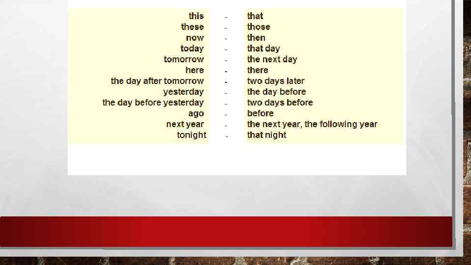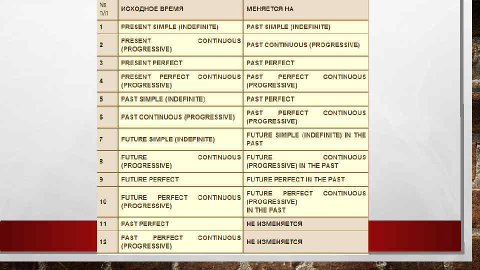 2. If the predicate of the main clause is in the past tense, the verb of the subordinate clause should be in one of the last times. For example: : Aidana said: “I learned biology yesterday” Aidana said that she learned biology the day before
