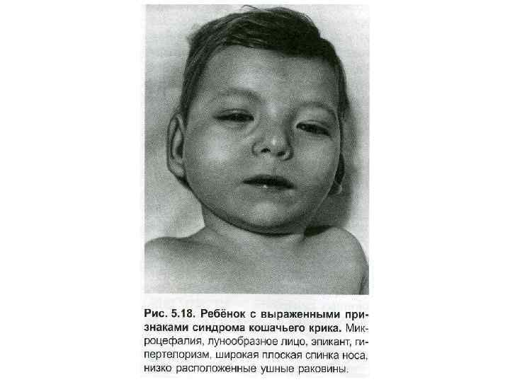 Делеция 5 p–: синдром кошачьего крика Дети имеют специфические признаки лицевой части (лунообразное лицо, эпикант, гипертелоризм), умственную отсталость, дефекты сердца и гортани (поэтому их плач похож на кошачье мяуканье)