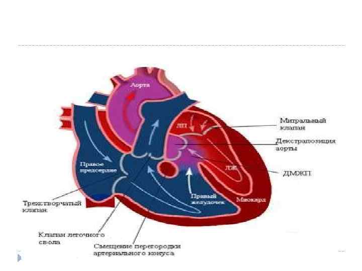 Классификация врождённых пороков сердца Нарушение гемодинамики Без цианоза ( «бледный» ) С цианозом ( «синий» ) С переполнением малого ДМПП круга кровообращения ДМЖП Открытый артериальный (боталлов) проток Транспозиция магистральных сосудов С обеднением малого круга кровообращения Изолированный стеноз лёгочной артерии Тетрада Фалло С обеднением большого круга кровообращения Стеноз устья аорты Коарктация аорты