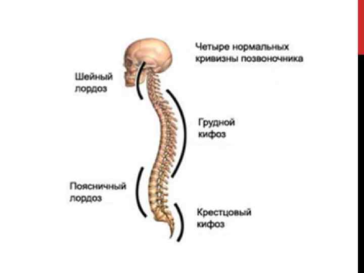У взрослого человека позвоночник имеет четыре изгиба в сагиттальной плоскости. Изгибы выпуклостью вперед называются лордозами, изгибы выпуклостью назад - кифозами. Благодаря им мы приобретаем правильную осанку: туловище и голова держатся вертикально, грудная клетка при ровной линии живота выступает вперед, нижние конечности стоят прямо и прочно.