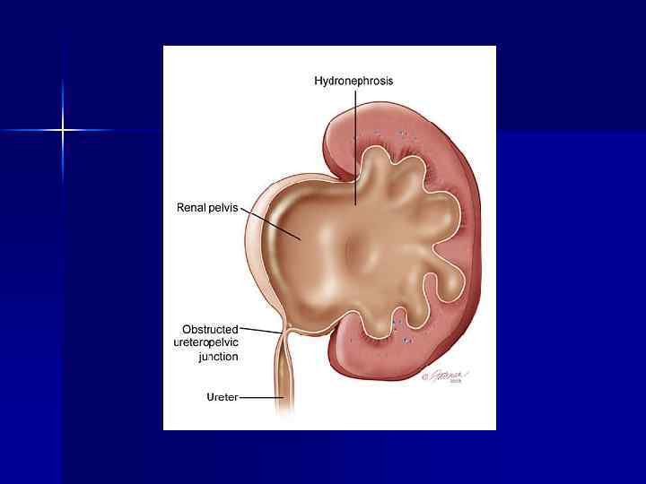 n Гидронефроз — стойкое, прогрессирующее расширение почечной лоханки и чашечек на почве нарушения оттока мочи в пиелоуретеральном сегменте, приводящее к постепенной атрофии почечной паренхимы.
