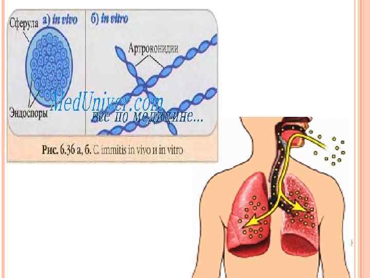 ВОЗБУДИТЕЛИ СИСТЕМНЫХ, ИЛИ ГЛУБОКИХ, МИКОЗОВ Кокцидиоидоз - эндемичный системный микоз с преимущественным поражением дыхательных путей. Морфология. Coccidioides immitis-при комнатной температуре (20 -22 С) и в естественных условиях растет в мицелиальной форме. Мицелий септирован, шириной 2 -4 мкм, без микроконидий. Культуральные свойства. Нетребователен к питательным средам. На среде Сабуро при комнатной температуре образует разнообразные колонии белого, серого или коричневого цвета. Эпидемиология. Кокцидиоидоз - сапроноз. Источником возбудителя инфекции является почва эндемичных зон, в которой в течение влажного сезона года идет интенсивный рост гриба, а с наступлением сухого сезона мицелий распадается на артроспоры, являющиеся единственным инфицирующим элементом. Больной человек незаразен для окружающих. Механизм передачи аэрогенный и контактный, путь передачи воздушно-пылевой. Любое соприкосновение с зараженной почвой в эндемичных зонах может привести к заражению. Патогенез. После заражения артроспоры в организме хозяина трансформируются в тканевую форму - сферулу. Сферулы представляют собой округлые образования размером 20 -90 мкм. При разрыве клеточной стенки сферул содержащиеся в них эндоспоры распространяются по организму, что обеспечивает диссеминацию возбудителя и формирование вторичных очагов. Вторичный кокцидиоидоз развивается у лиц с нарушенным клеточным иммунитетом