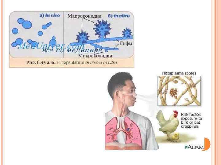 ГИСТОПЛАЗМОЗ природно-очаговый глубокий микоз, характеризующийся преимущественным поражением дыхательных путей. Различают американский (Н. capsulatum) и африканский (Н. duboisii) гистоплазмоз, который регистрируется только на африканском континенте. Для последнего характерны поражения кожи, подкожной клетчатки и костей у сельских жителей, а также у лиц, контактирующих с почвой и пылью. Морфология. Мицелиальная фаза представлена септированным мицелием толщиной 1 -5 мкм, микроконидиями сферической или грушевидной формы диаметром 1 -6 мкм, бугристыми макроконидиями диаметром 10 -25 мкм. Культуральные свойства. Колонии дрожжеподобные блестящие, мягкой консистенции. Оптимальная температура роста 25 -30 С, р. Н 5, 5 -6, 5, но возможен рост в широких интервалах р. Н - 5, 0 -10, 0. Эпидемиология. Гистоплазмоз - сапроноз. Источником возбудителя инфекции для человека и животных служит почва эндемичных зон. Эндемичные зоны выявлены в Северной, Центральной, Южной Америке, странах Карибского бассейна, Южной Африке, Индии, Больные люди и животные незаразны для окружающих. Механизм передачи аэрогенный, путь передачи воздушно-пылевой. Восприимчивость населения всеобщая. Патогенез. Заражение происходит микроконидиями, которые трансформируются в организме в дрожжевые клетки. Клиническая картина зависит от иммунного статуса организма: острые формы наблюдаются у детей в силу особенностей их иммунной системы, хронические диссеминированные формы развиваются на фоне недостаточности клеточного звена иммунитета.