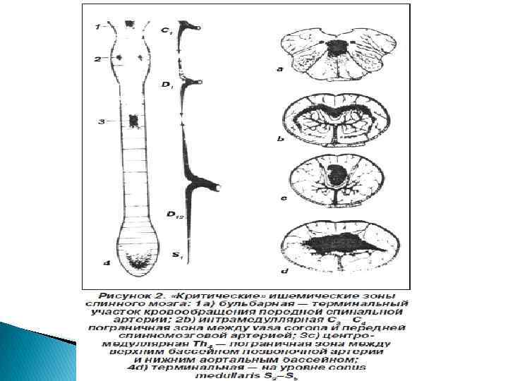 Синдром ишемии краевой зоны передних и боковых канатиков Проявляется спастическим парезом конечностей, мозжечковой атаксией и легкой проводниковой парагипестезией. Острое начало заболевания и в последующем возможность интермиттирующего течения напоминают спинальную форму рассеянного склероза. Диагностике помогает наблюдение за дальнейшим развитием заболевания.