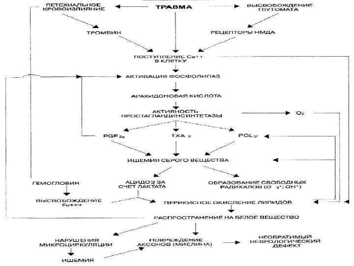 Этиология Наиболее частыми причинами являются травма позвоночника и аномалии сосудистой системы спинного мозга (артериовенозные аневризмы и др. ). Реже гематомиелия развивается при геморрагическом диатезе, инфекционных васкулитах и др. Очаг кровоизлияния обычно располагается в сером веществе одного или ряда смежных сегментов.