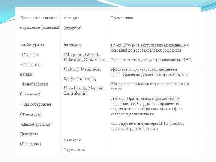 Лечение отравления барбитуратами Необходимо промыть желудок через толстый зонд, провести энтеросорбцию, повторно промыть желудок, через 6 ч сифонные клизмы. При коме показаны гемосорбция, гемодиализ. При любой степени тяжести отравления применяют инфузнонную терапию и форсированный диурез. Следует вводить 500 мл 4 % раствора гидрокарбоната натрия (нейтрализует барбитураты), 500 мл 10 -20 % раствора глюкозы с 5 мл аскорбиновой кислоты и 16 ЕД инсулина (окисляет барбитураты). При коме - защита мозга (холод на голову, ГОМК) в первые сутки отравления. Отек мозга требует переливания белков (альбумины, плазма), назначения мочегонных средств. Если имеется первичный токсикогенный коллапс или ЭТШ применяют противошоковую терапию. Аналептики (бемегрид) назначают в малых дозах (10 -20 мл) только при поверхностной барбитуровой коме, при глубокой они противопоказаны, так как вызывают судороги, увеличивают потребность мозга в кислороде. При угнетении дыхания используют ИВЛ.