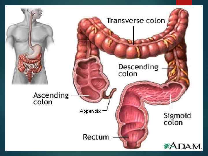 Толстая кишка Intestinum crassum ( греч. colon) имеет 3 основных отдела: § Caecum et appendix vermiformis § Ободочная кишка: colon ascendens, colon transversum, colon descendens, colon sigmoideum (греч romanum) § Rectum (греч proctos )